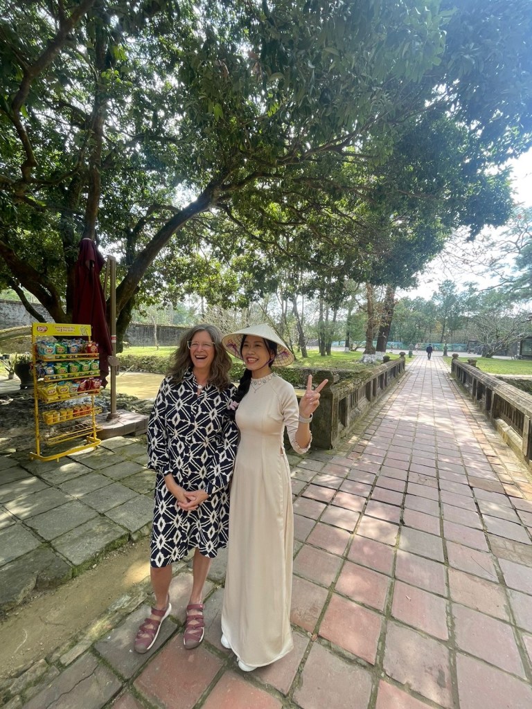 The young women who are in high school typically wear white Áo dài and the straw conical hat (maybe mũ hình nón.) The hats have 16 rings which symbolizes the perfect age. (I strongly call BS! And I happen to be adding this on my 58th birthday.)