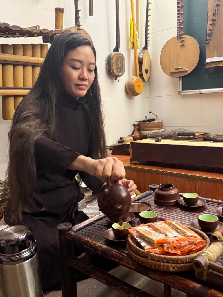 We spent time with a famous musician while in Hanoi. He was accompanied by his student, who is now a teacher as well. She expertly played traditional instruments with elegance and grace. When I tried to pluck a few measly notes she was gentle and encouraging yet firm.