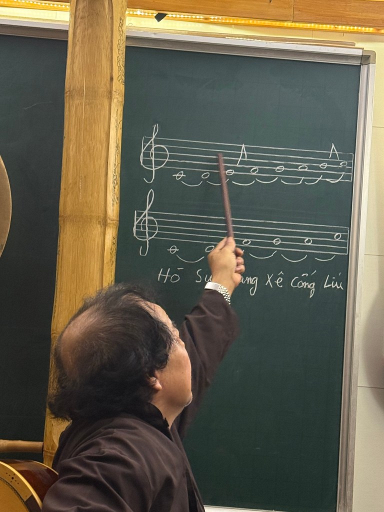 Vietnamese music developed in parallel and reflects this dynamic sing-song language. In order to create the sounds that wobble and bend, and rise and fall, they need flexibility. Variations within a single note – bends, slides etc mimic the variations in a given vowel.