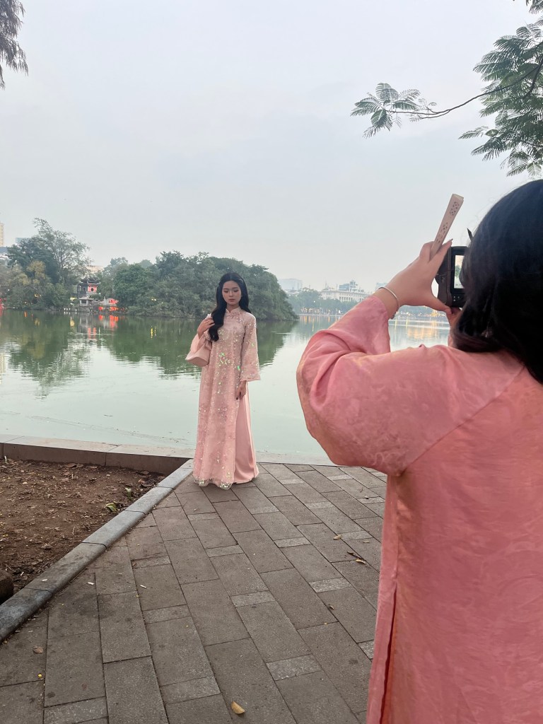 With the coming of the New Year many young women gather at the picturesque lake in the center of town, Hoan Keim Lake. They are elegantly dressed in the traditional ao dai ( pronounced ow zigh.) They pose in practiced positions and look quite demure.