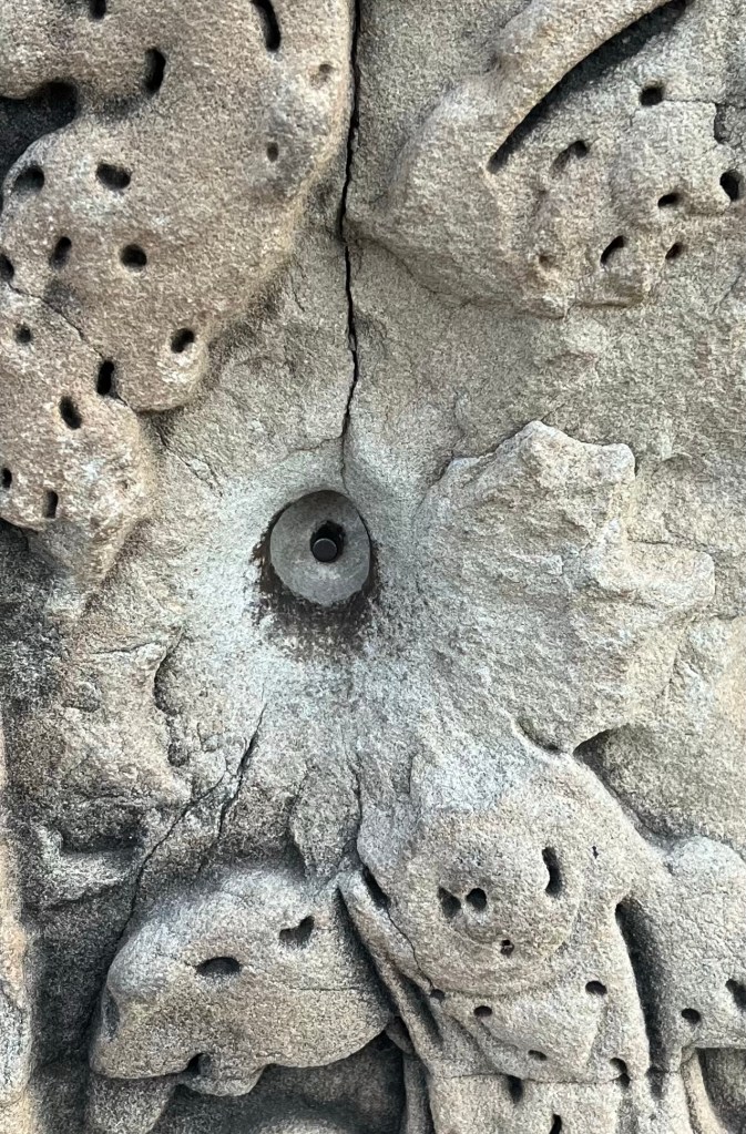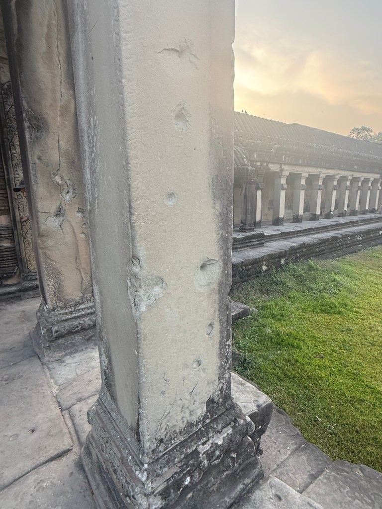 Angkor Wat is also one of the most thoroughly restored temples in Cambodia. It’s a little confusing as to what’s old and what’s restored. But all renovations are made from the same quarries as the original mines (sans elephant.) Some care was given to leave evidence of desecration like these Khmer Rouge bullet holes in the first gate.