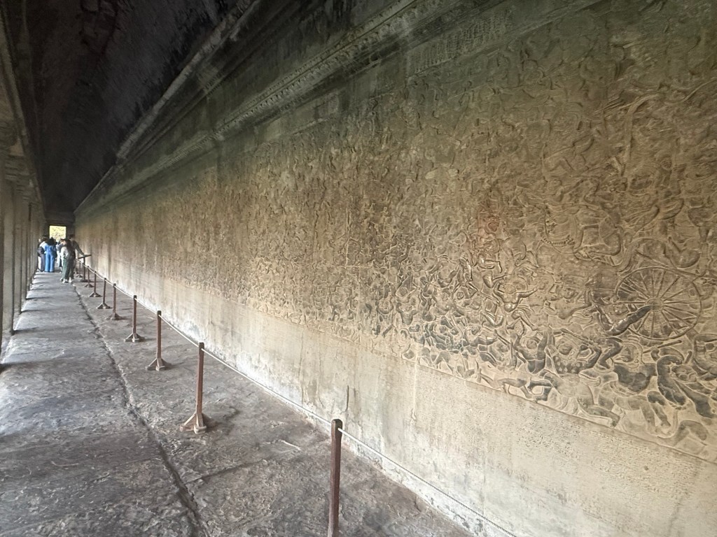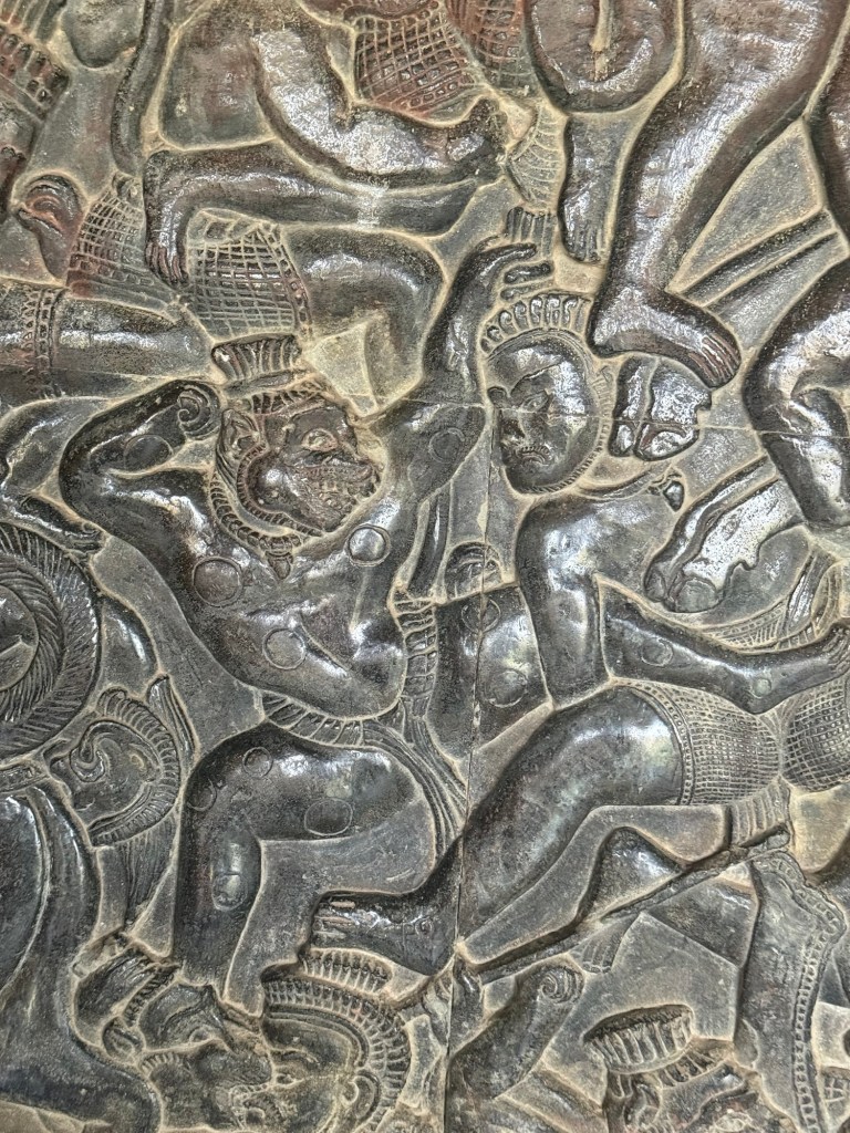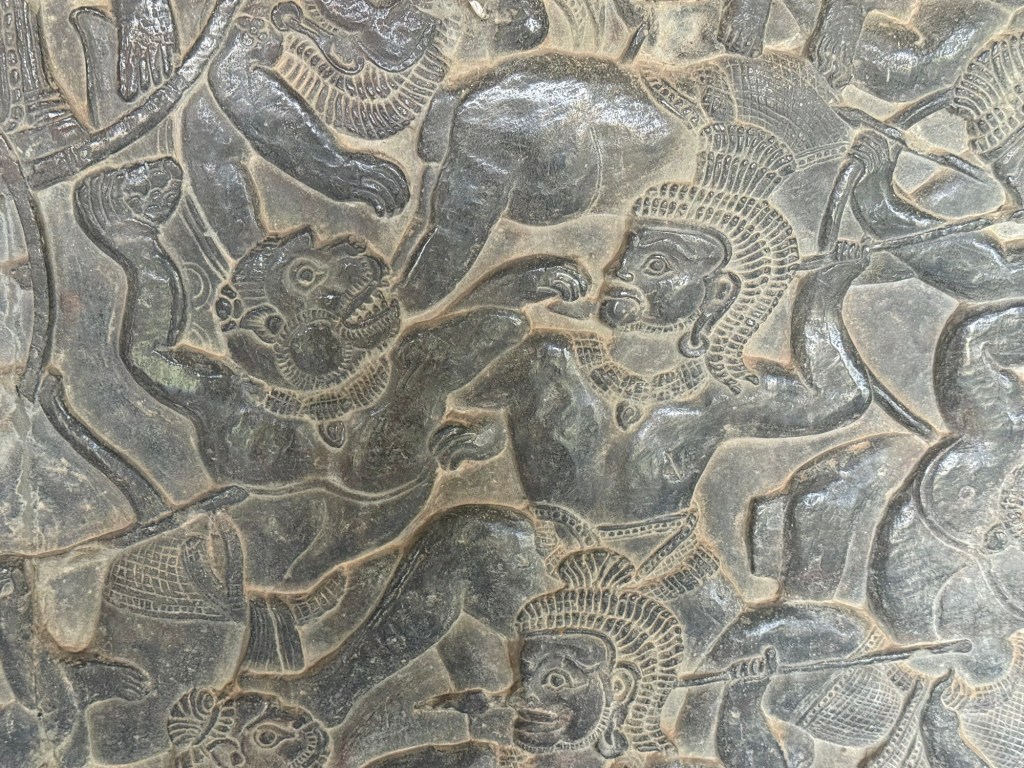 A 100 feet wall carving depicts an army of monkey troops (led by Hanuman the monkey God) in vicious hand to hand battle with both demons and enemies of the king. This mural represents the Battle of Lanka and the recapture of the abducted queen Sita – the last scene in an epic 8 hour Hindu saga.