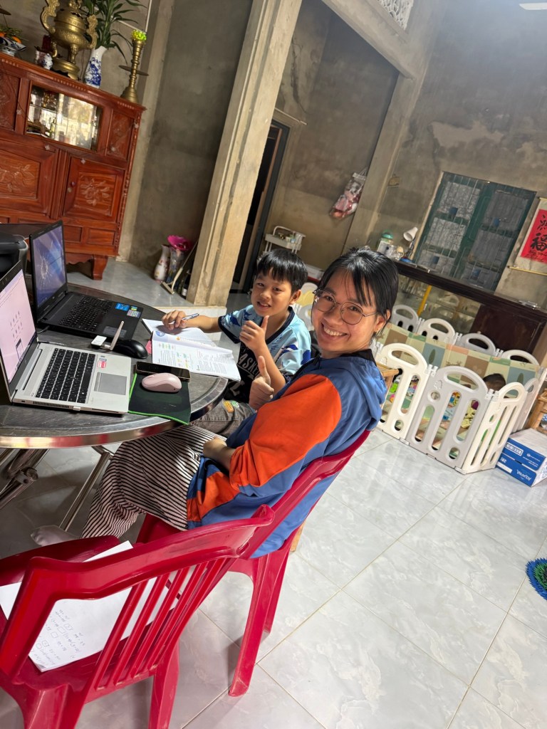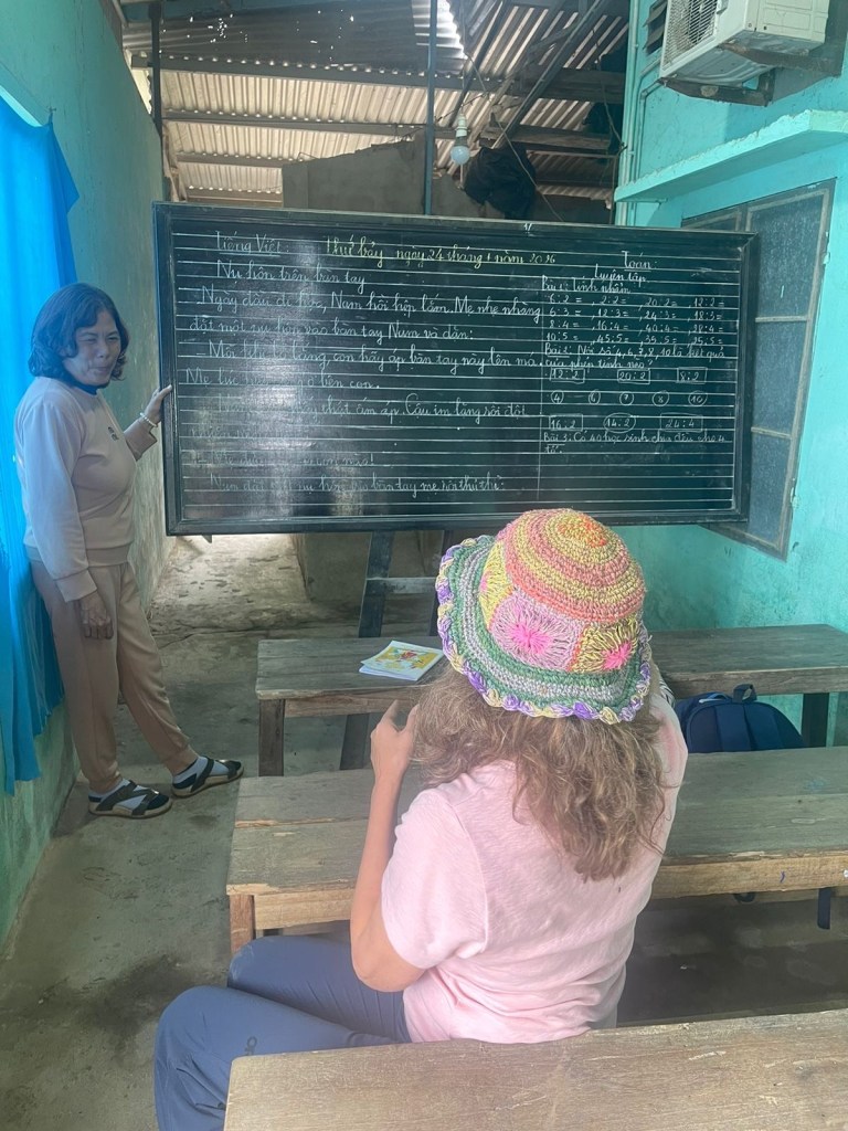 The economics of the household were basically rice farming (including a Party subsidy), a kitchen garden, and a cow. Tien let us know that the tours Phap gave to tourists was also huge part of their living as was the salary for Phap’s wife. She was a teacher, and actively tutoring on a laptop (which seemed wildly out of place) when we arrived. We learned that their other son’s university education cost one cow for two years.