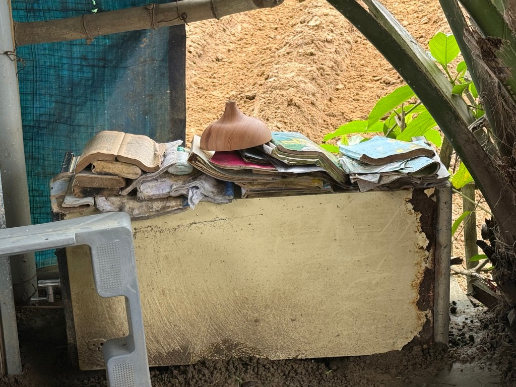 A tour of the house, revealed some interesting features. It consisted of the two bedrooms, a main room and central shrine, and an outdoor kitchen, and dining rooms. Phap (France) the oldest son and his wife shared a room, and the sister and baby (Tintin) lived in the main room.
