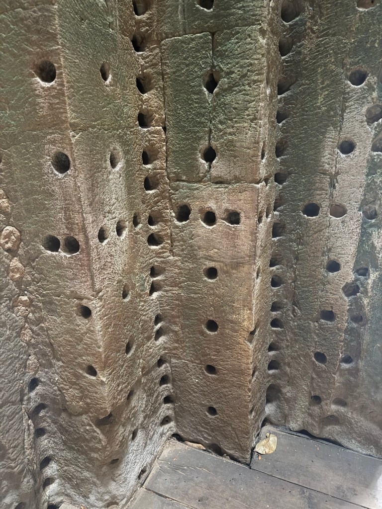 Angkor Wat is also one of the most thoroughly restored temples in Cambodia. It’s a little confusing as to what’s old and what’s restored. But all renovations are made from the same quarries as the original mines (sans elephant.) Some care was given to leave evidence of desecration like these Khmer Rouge bullet holes in the first gate.