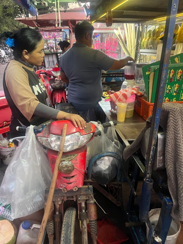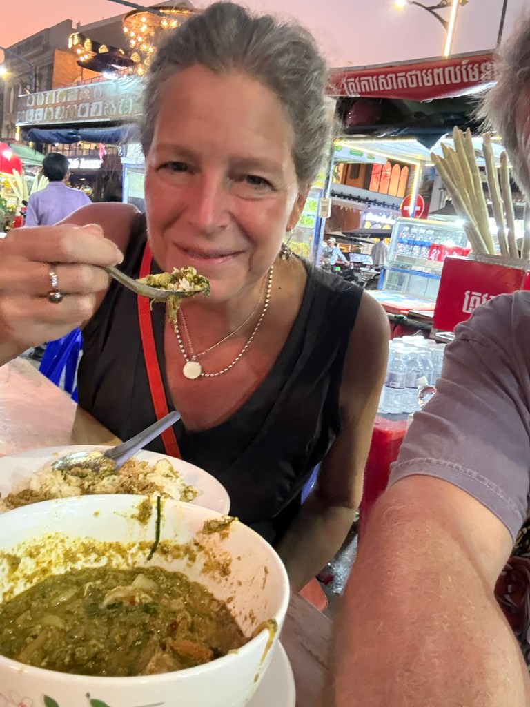 Street food: Amok (traditional Cambodian stew) and fresh fruit and rum slushies (blender powered off a motorcycle!). Grilled quail, squid, and pork belly.