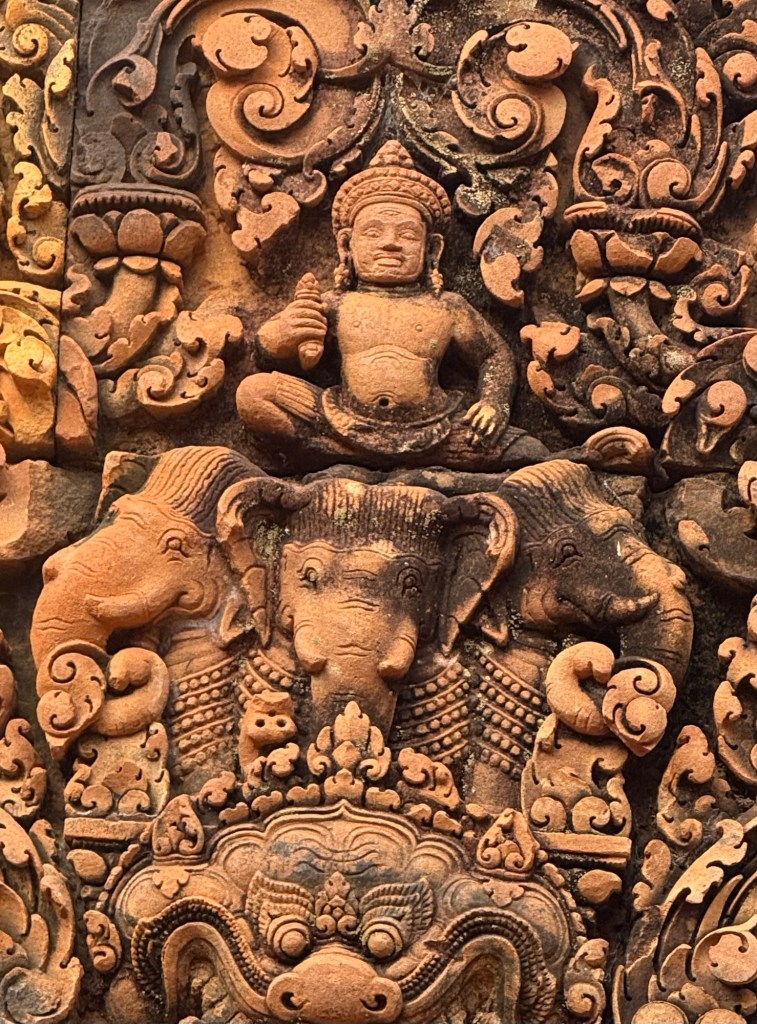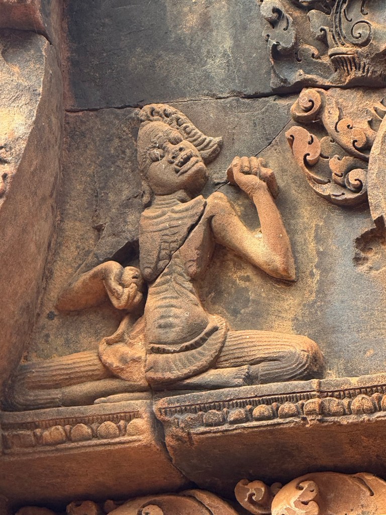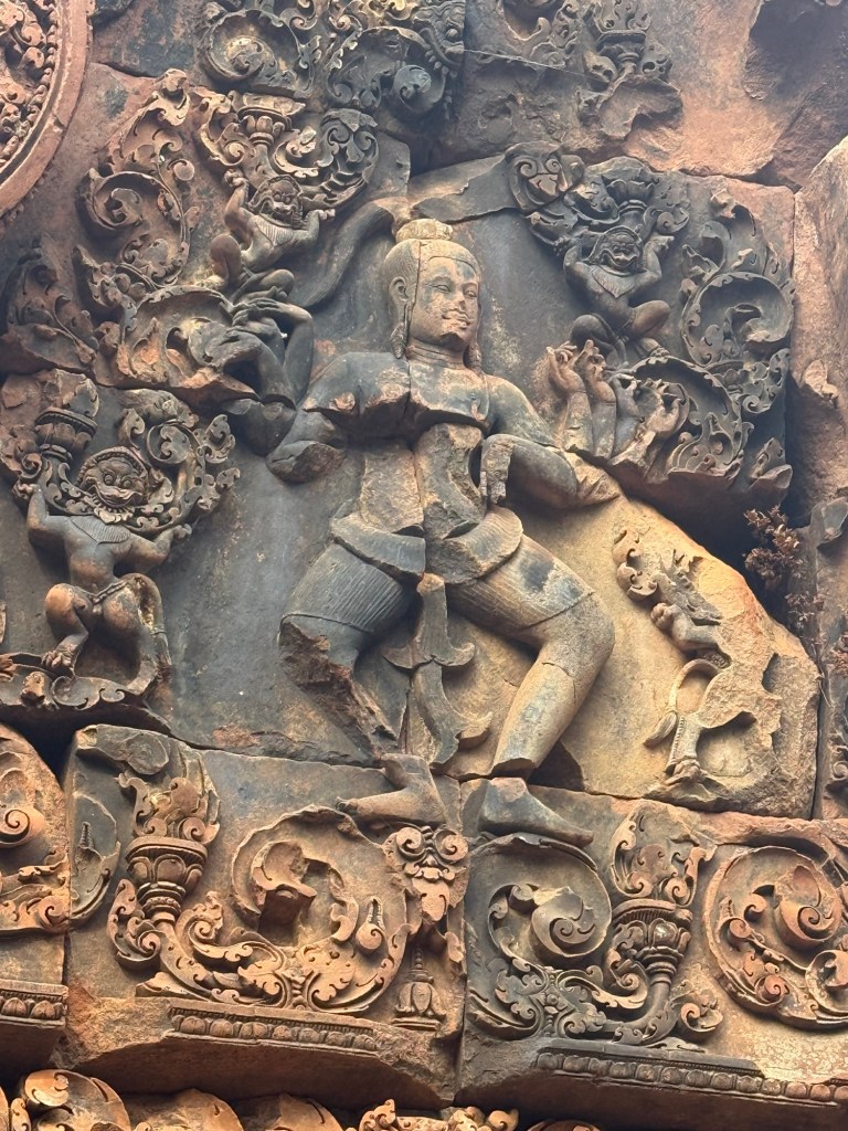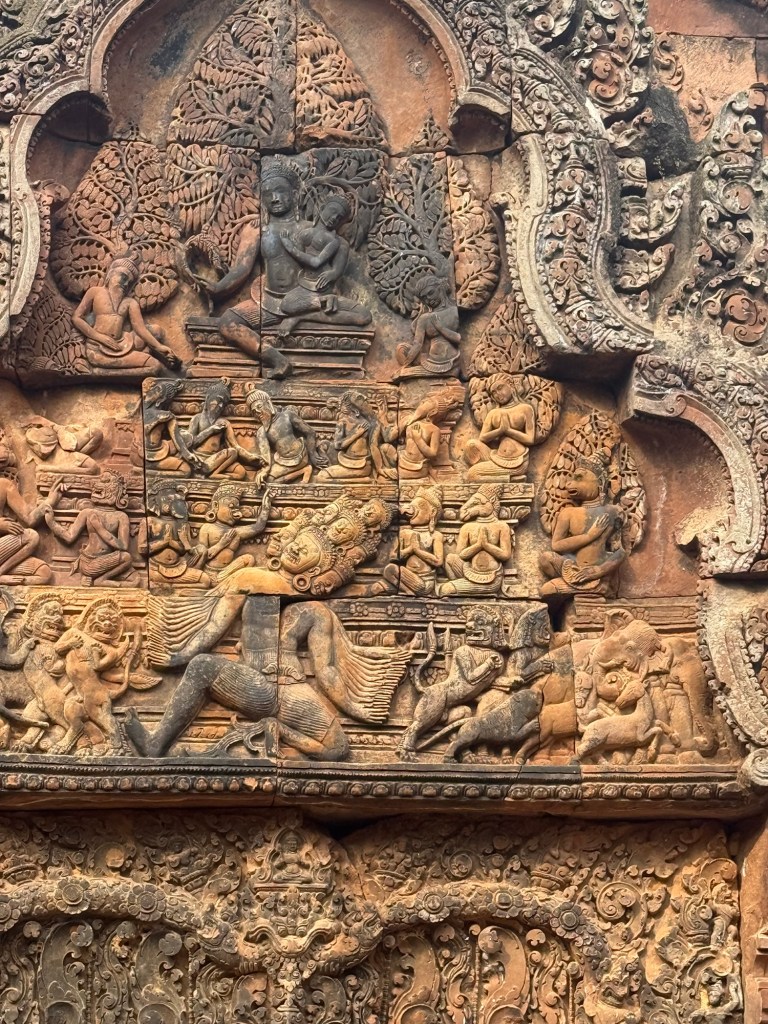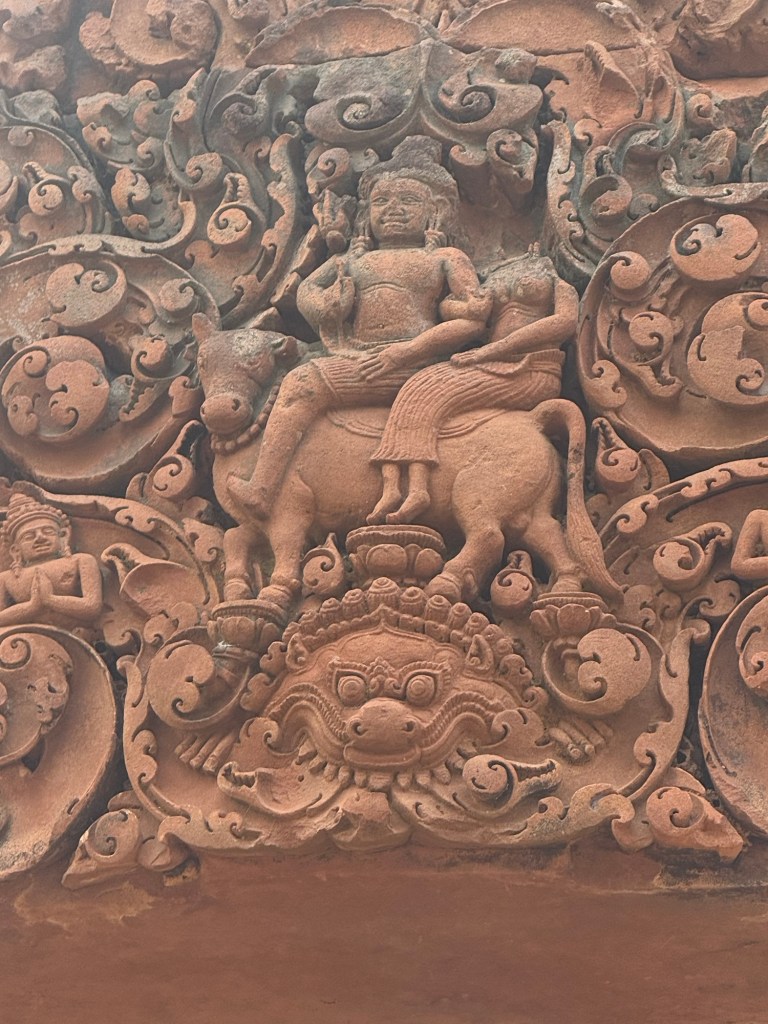 Banteay Srei TempleCausewayLow entrances force you to bow on entering Vishnu – God of Earth on the Sacred Bull Nandi.Nani – aged by Vishnu to prevent war over her beautyMany Armed Shiva the DestroyerDemon King (10 faces, 20 arms), shaking the mountain to interrupt Shivas meditation